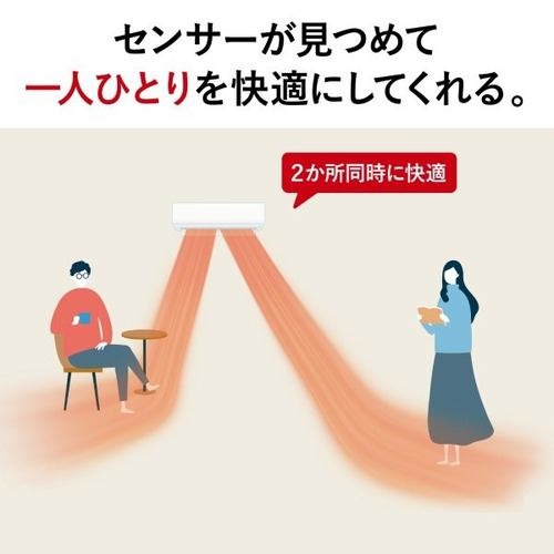 ●赤外線センサー「ムーブアイ」が、床や壁などの温度から体感温度を測り、人の位置も見て冷やしすぎない、あたためすぎない快適な空調を実現します。