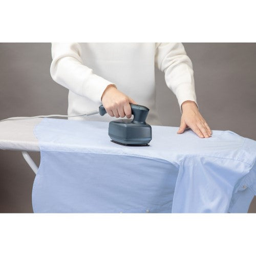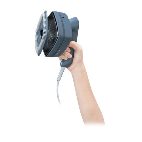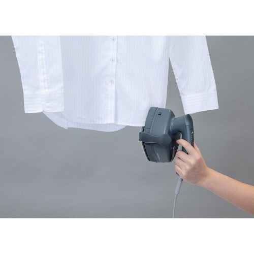 ●アイロン台不要「プレスアタッチメント」ではさんで仕上げる。衣類にスチームした後に先端を伸ばしたり、ズボンのセンターラインをつけるなど最後にしっかりプレス仕上げをすることができます。