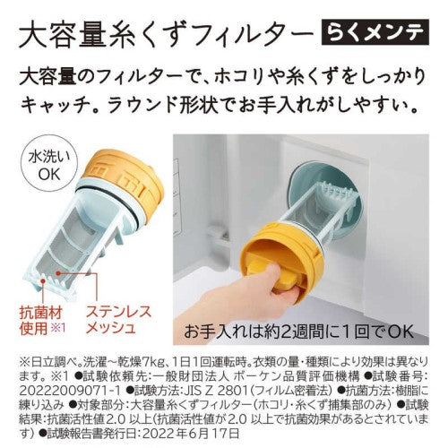 ●乾燥時のホコリや糸くずは、次の洗濯運転時に、[洗濯槽自動おそうじ][乾燥経路自動おそうじ][ドアパッキン自動おそうじ]の3つの自動おそうじで洗い流して、[大容量糸くずフィルター]で捕集。
