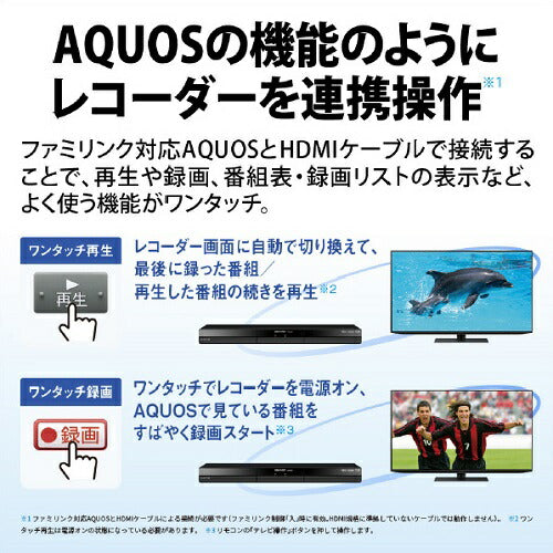 ●録画番組のジャンルに合わせて,AQUOS側で画質・音質を調整する「AIオート高画質・高音質」連動や、AQUOSの機能のようにレコーダーを操作できる「AQUOSファミリンク」など、AQUOSとセットで使うことで快適になる機能が充実。さらに、本体は高さが41.5mmの薄型デザイン。