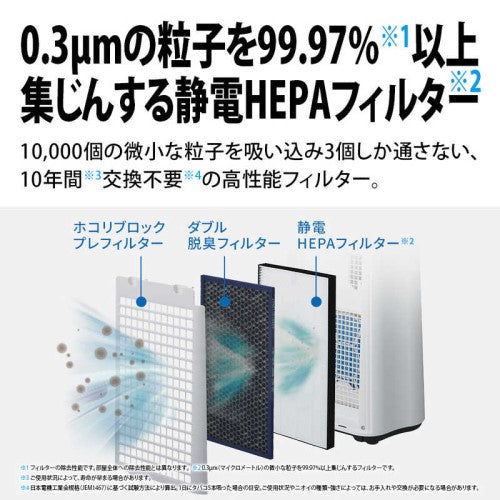 ・付属品:静電HEPAフィルター 1枚、脱臭フィルター 1枚、加湿フィルター 1枚、使い捨てプレフィルター 3枚、使い捨て加湿プレフィルター 2枚、Ag+イオンカートリッジ 1個