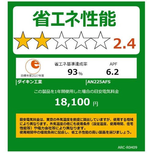 標準取付工事別 ルームエアコン 2025年モデル Fシリーズ ホワイト [おもに6畳用 /100V] ダイキン AN225AFS-W