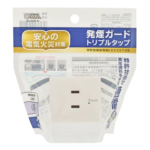 発煙ガードトリプルタップ 3個口 オーム電機 HS-AT3H-W