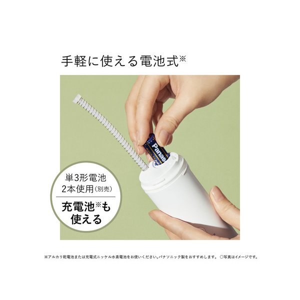●単3形アルカリ電池、または単3形充電式電池2本で水圧レベル2設定時、約20分使用可能。毎日の充電の手間がなく、充電コードも不要で手軽に使え、旅行など外出先での使用にもピッタリです。