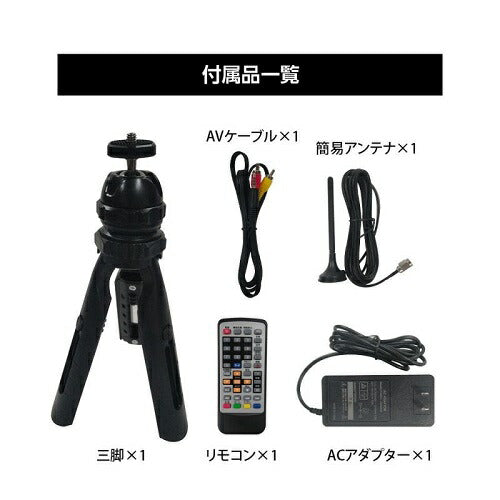・付属品:リモコン×1、リモコン用コイン形電池×1(取付済み)、ACアダプター×1、簡易アンテナ×1、mini B-CASカード×1、三脚×1、AVケーブル×1、取扱説明書×1部